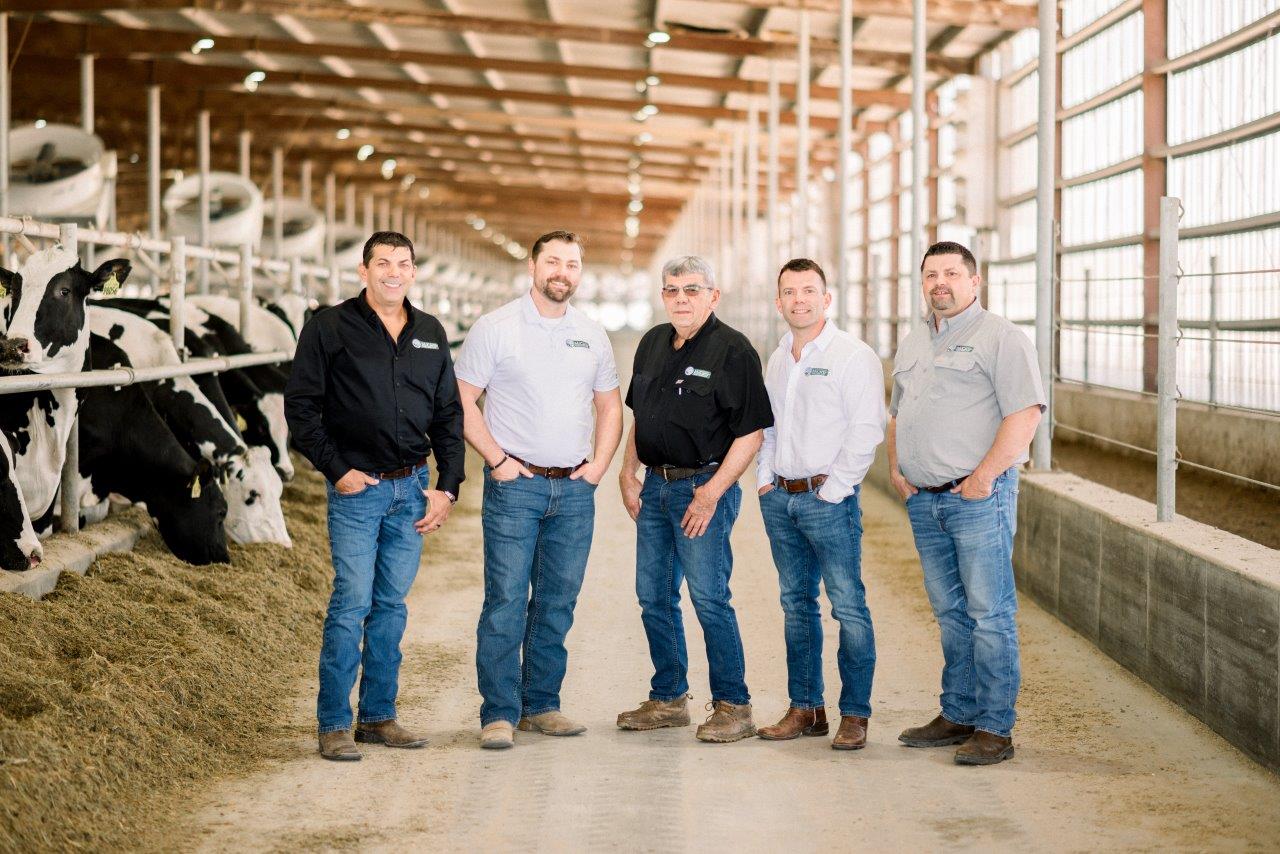 Pictured: McCarty Brothers and Dad. Left to right: Clay, Ken, Tom (dad), Dave, Mike McCarty in a freestall barn in Rexford, KS